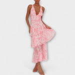 Entdecken Sie das Domenica - Chiffonkleid mit V-Ausschnitt und fließenden Lagen von bsc, das durch seine ätherische Eleganz besticht und die Essenz des Sommers perfekt einfängt. Dieses Maxikleid wurde speziell für stilbewusste Frauen entworfen, die Wert auf eine schmeichelhafte Silhouette legen und sich anmutig bewegen möchten – ideal für festliche Anlässe und sommerliche Cocktailpartys.
