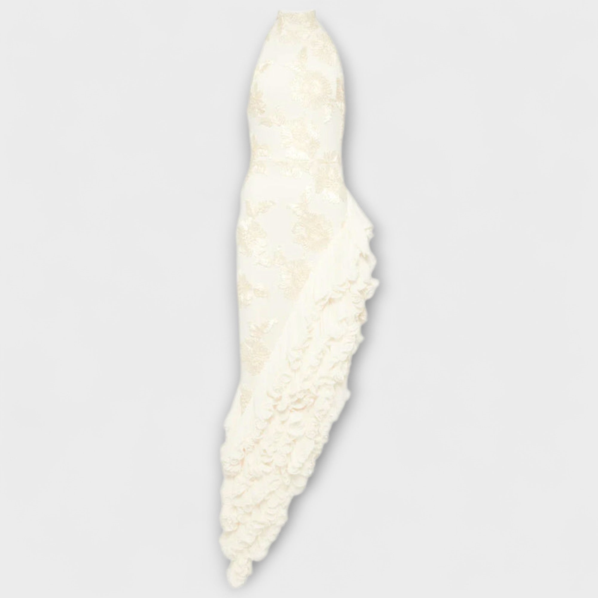 - Fein gearbeitete Details: Mit liebevollen Rüschen und hochwertiger Verarbeitung, die den edlen Charakter des Kleides unterstreichen.
