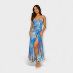 Entdecken Sie das Audrey - Blumendruck-Trägerkleid für Damen von unserer exklusiven Kollektion, das mit seinem stilvollen und verführerischen Design den Hauptvorteil bietet, Ihre feminine Ausstrahlung bei sommerlichen Anlässen perfekt in Szene zu setzen. Dieses Maxikleid ist speziell zugeschnitten auf Frauen, die Eleganz mit einem Hauch von kühler Frische kombinieren möchten.