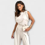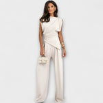 Entdecken Sie das Sofia - Asymmetrisches Ensemble mit Drapierten Schultern von Marke, das durch seine skulpturale Eleganz und den modernen Touch besticht. Dieses Outfit überzeugt mit einer einzigartigen Silhouette, die durch das asymmetrische Top und die weit geschnittenen Hosen stilvoll und elegant fließt – ideal zugeschnitten auf besondere Anlässe oder ein verfeinertes Alltagsoutfit.